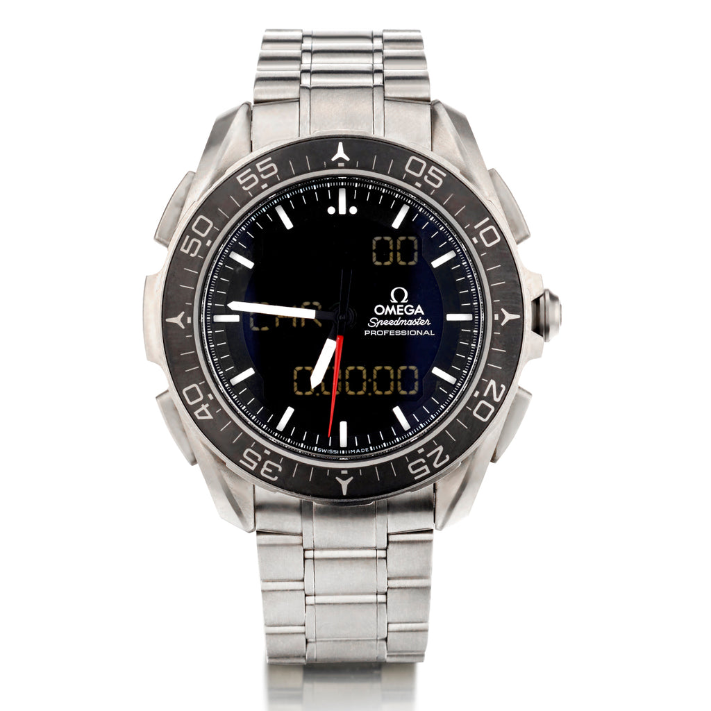 Omega X33 "Skywalker in titanium. Integrated titanium bracelet. 45mm x 15.1mm case size. Analog-digital LCD display. Calibre:5619 which is a high precision thermocompensated quartz movement. Functions: Calendar, date, time and triple alarm.60 minute turning bezel. Water resistant: 30 metres / 1,000 feet. Sapphire crystal.