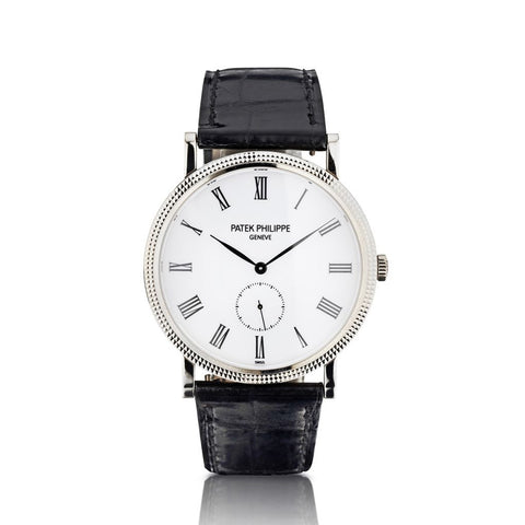 Gent's 18kt white gold Patek Philippe Calatrava wristwatch. White dial with black hands and Roman numeral hour markers; small seconds sub-dial at the 6 o'clock position. Sapphire crystal. Skeleton back. 36mm case diameter. Black leather strap with original tang clasp. Manual winding movement. Year 2016. Reference #: 5119G-001.