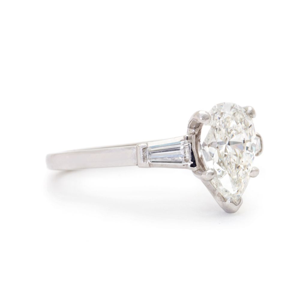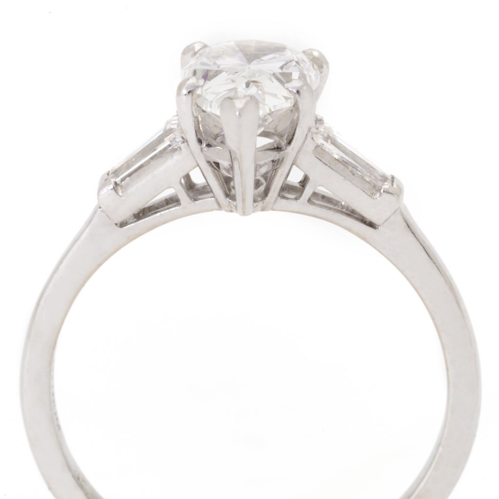 Ladies platinum and diamond handmade ring featuring a pear shape diamond weighing 2.60 carat weight of (VS) in clarity and (G) in color. Featuring  2 X 0.30 total carat weight of tapered baguettes of (VS) in clarity and (G) in color.Current finger size: 6-1/2. This ring can be resized