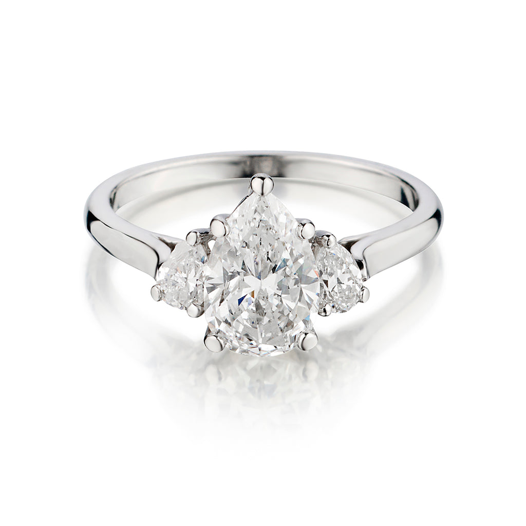 Platinum diamond ring featuring a Pear shape diamond weighing 1.10 carat weight of (VS) in clarity and (F-G) in colour. Also featuring 2 x 0.30 total carat weight of Pear shape diamonds. Current finger size: 5-3/4.This ring can be resized