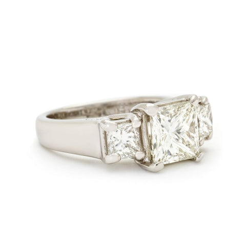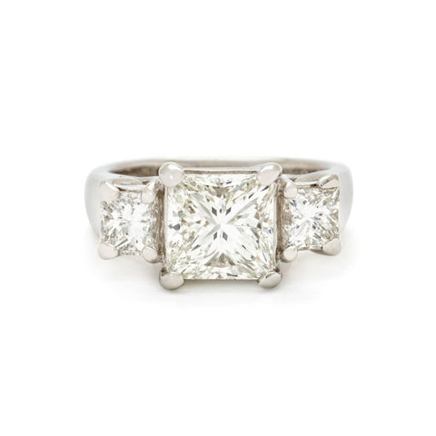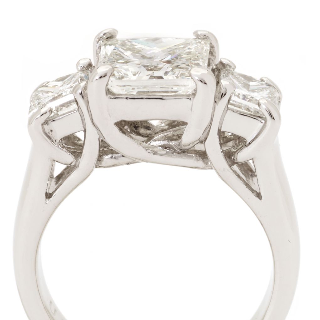 Ladies Platinum and Diamond Ring featuring a Princess cut diamond in the centre weighing 2.28 carat weight of (VS-2) in clarity and (H) in color.On either side of the centre diamond are 2×0.70 total carat weight of Princess cut diamonds of (VS) in clarity and (G) in color.