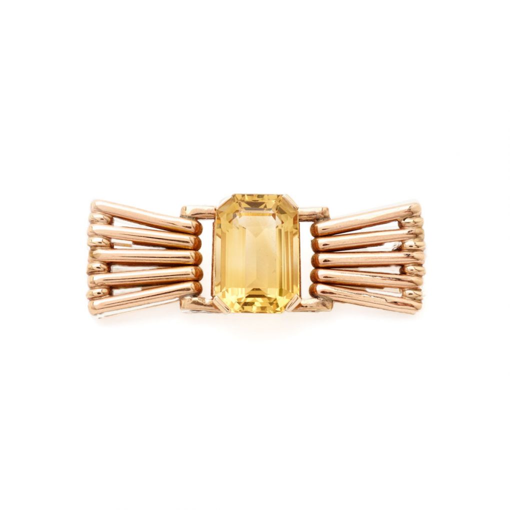 • Retro Emerald Cut Citrine & 14 Karat Rose Gold Brooch