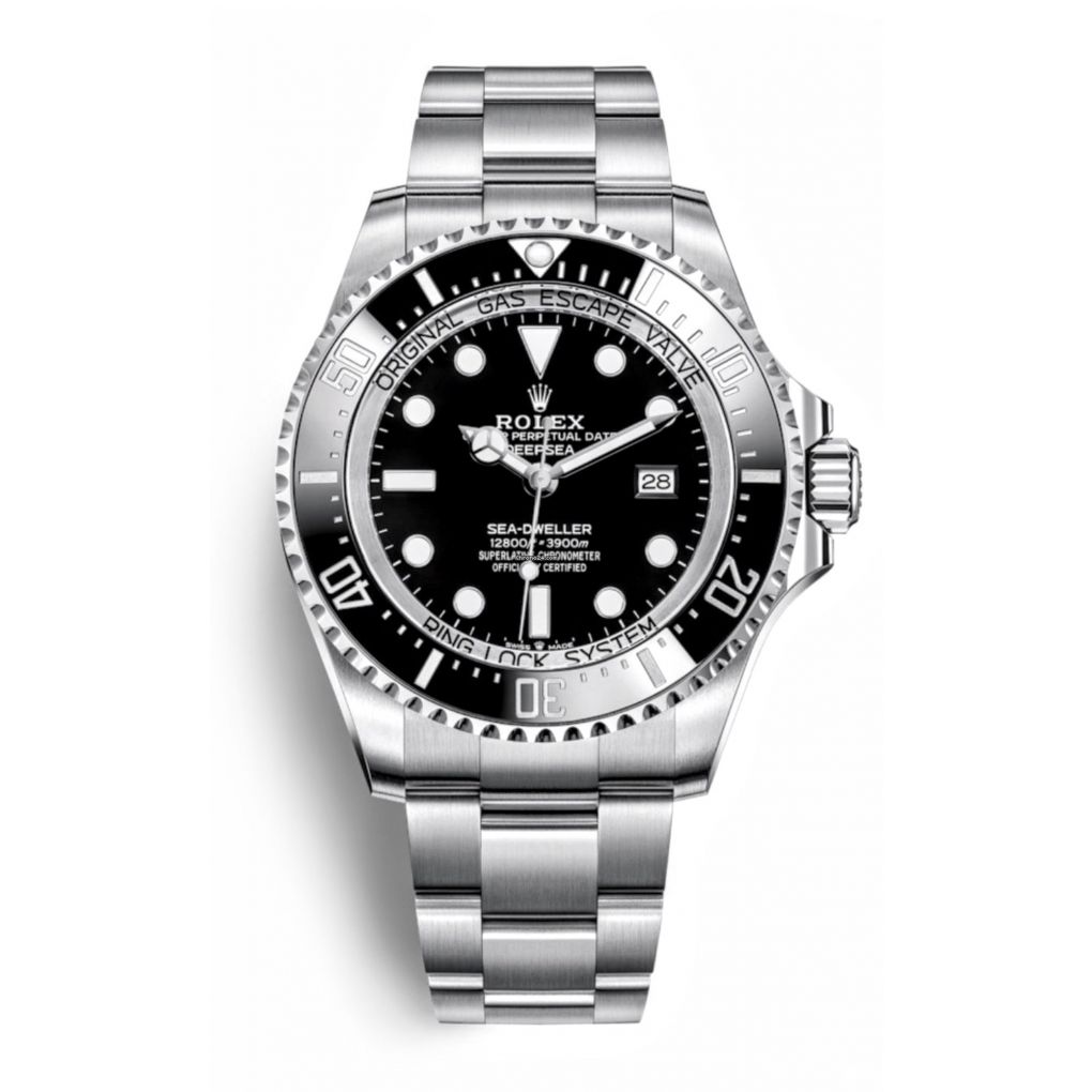 Gent’s stainless steel Rolex Oyster Perpetual Deepsea wristwatch. Stainless steel Oyster bracelet with a folding Oysterlock safety clasp; Rolex Glidelock extension system.Black dial with luminous hour markers; chromolight display; date aperture at the 3 o’clock position.Rotating black bezel 44mm case diameter. Domed, 5 mm-thick scratch-resistant sapphire crystal. Self-winding automatic movement; cal. 3135. Purchased in 2015. Ref. #: 116660.