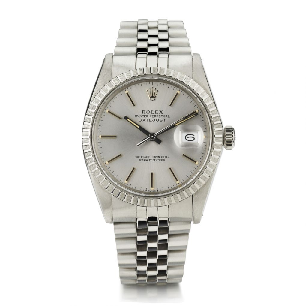 Gent's stainless steel Rolex Oyster Perpetual Datejust wristwatch. Stainless steel fluted bezel. Silver dial with index hour markers; date display at the 3 o'clock position. Integrated stainless steel jubilee bracelet. Acrylic crystal. Solid caseback. 36mm case diameter. Automatic movement; calibre 3035; 27 jewels. Year 1980. Reference #: 16030.