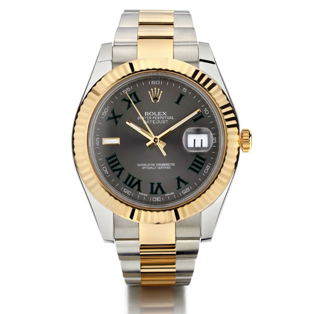 Gent’s 18kt yellow gold and stainless steel Rolex Oyster Perpetual Datejust II wristwatch. Integrated two-tone Oyster bracelet with Oysterlock clasp. Grey slate dial with luminous hands. Green Roman numerals hour markers. Date aperture at the three o’clock position. Fixed 18kt yellow gold fluted bezel. 41mm case diameter. Automatic movement. Sapphire crystal. Circa 2021. Ref.#:126333.