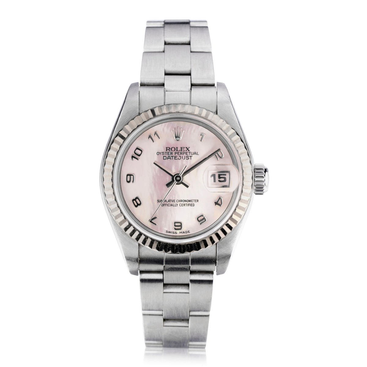 Ladies stainless steel Rolex Oyster Perpetual Datejust wristwatch. Integrated stainless steel Oyster bracelet. Mother of pearl dial with Arabic numeral hour markers: date display at the 3 o'clock position. 18kt white gold fixed fluted bezel. 26mm case diameter. Automatic movement. Sapphire crystal. Year 2002. Reference number: 79174