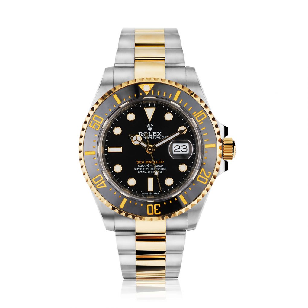 Gent's 18kt yellow gold and stainless steel Rolex Oyster Perpetual Sea-Dweller wristwatch. Integrated two-tone Oyster bracelet. Uni-directional rotating black cerachrom bezel. Black dial with gold-tone Mercedes-logo, sword and Breguet-style shape hands and dot hour markers; minute markers around outer rim. Luminescent hands and markers; date display at the 3 o'clock position. Automatic movement; Rolex Caliber 3235. 43mm case diameter. Sapphire crystal. Solid caseback. Year 2021. Reference #: 126603.