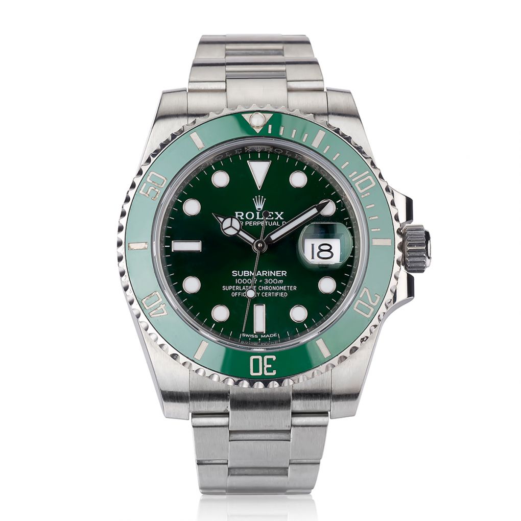 Gent's stainless steel Rolex Oyster Perpetual Submariner Date wristwatch commonly referred to as 'The Hulk'. Green dial with Chromalight display; long-lasting blue luminescence; magnified date aperture at the 3 o'clock position. Unidirectional rotating Cerachrom insert in ceramic bezel. Stainless steel Oyster bracelet with the folding oysterlock safety clasp, and features the Glidelock extension system. Sapphire crystal. Self-winding, Automatic movement; Cal. 3135. 40mm case diameter. Ref. #: 116610LV. Circa 2019.