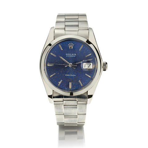 Gent's stainless steel Rolex Oysterdate Precision wristwatch. Blue dial with silver-tone hands and index hour markers. date display at the 3 o'clock position. Integrated stainless steel Oyster bracelet. Rolex Calibre 1225 manual winding movement. Acrylic crystal. 34mm case diameter. Circa 1970. Reference #: 6994.