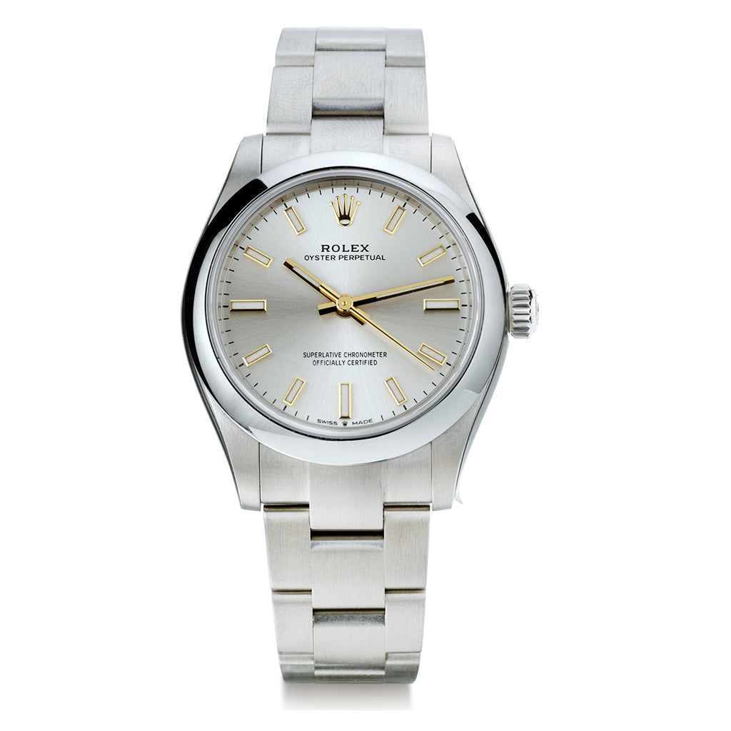 Rolex stainless steel oyster perpetual wristwatch. Integrated oyster bracelet. Silver dial with gold indices. Case size: 31mm. Automatic movement. Caliber: 2232. Jewels: 31. Power reserve: 55 hours. Water resistance: 10 ATM. Sapphire crystal. Circa 2023.