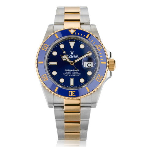 Rolex Submariner in steel and 18kt yellow gold. Integrated steel and 18kt yellow gold oyster bracelet.41mm case size. Ceramic Blue dial and bezel Automatic movement. Caliber 3235. Power reserve:70 hours. Jewels:31.Water resistance: 30 ATM.Sapphire crystal.Circa 2021