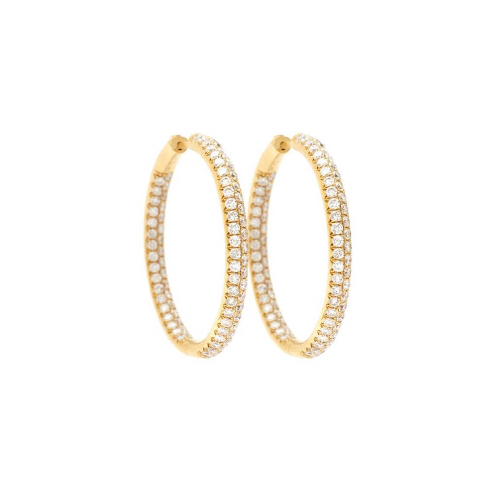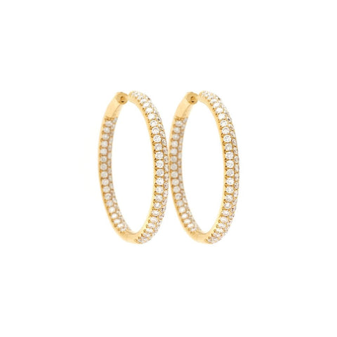 Ladies large 18KT yellow gold Round-shaped diamond hoop earrings featuring 2 rows of pavé-set Round Brilliant-cut diamonds weighing approximately 1.64 carat total weight of (SI) in clarity and (G-H) in color, diamonds inside and outside. Measuring :22mm x 3.5mm (W). Interior diameter: 13mm. Post and hinged secure back