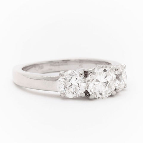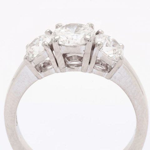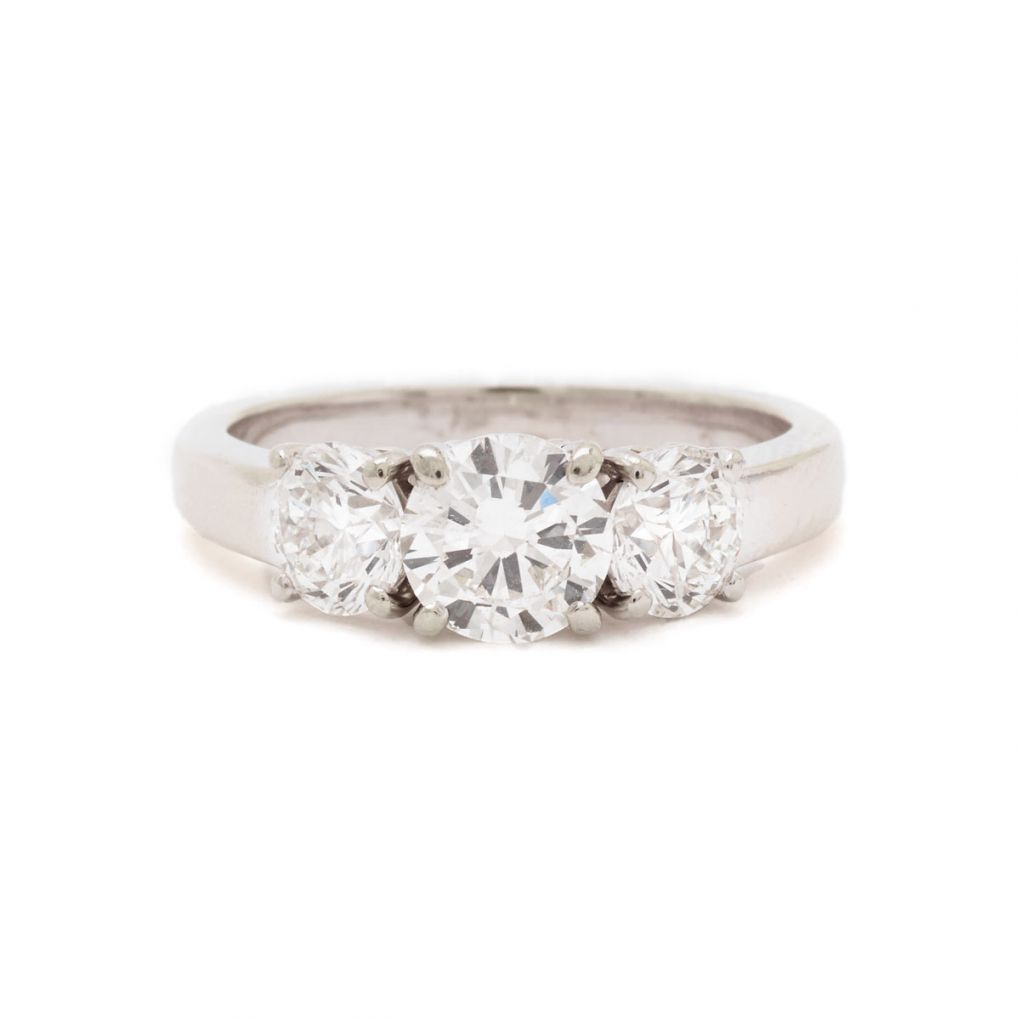 Ladies 18KT white gold Royal De Versailles three-stone ring featuring a 0.90 carat Round Brilliant-cut diamond of (VS-2) in clarity and (G) in color. The center-stone is flanked by a round brilliant cut diamond on either side weighing 0.90 total carat weight.