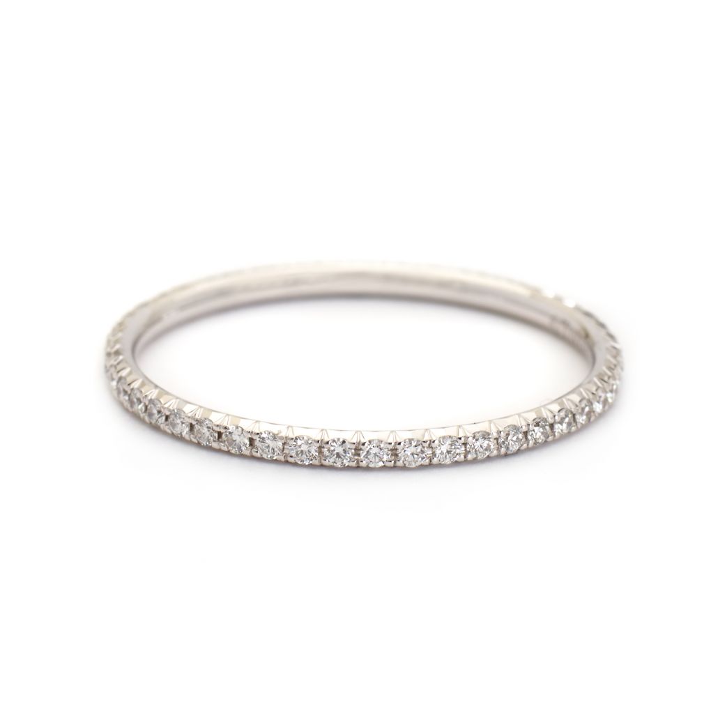 Ladies beautiful Tiffany & Co. 18kt white gold Metro ring featuring a full circle of small round brilliant cut diamonds . Finger size 5.