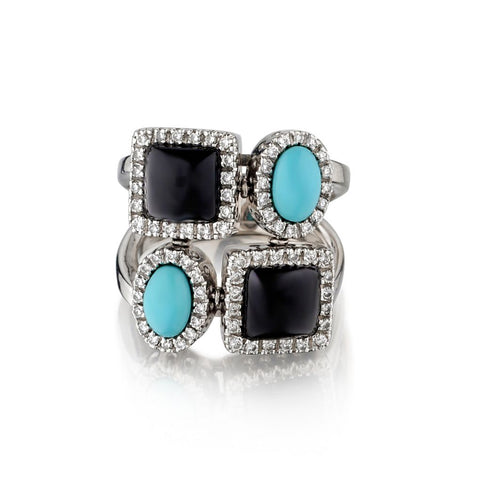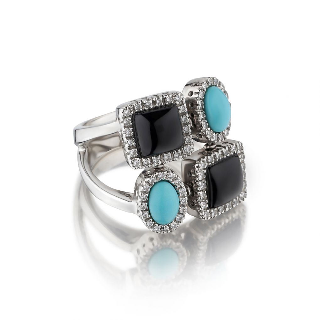 Torquoise, Onyx and Diamond ring. 18kt White Gold