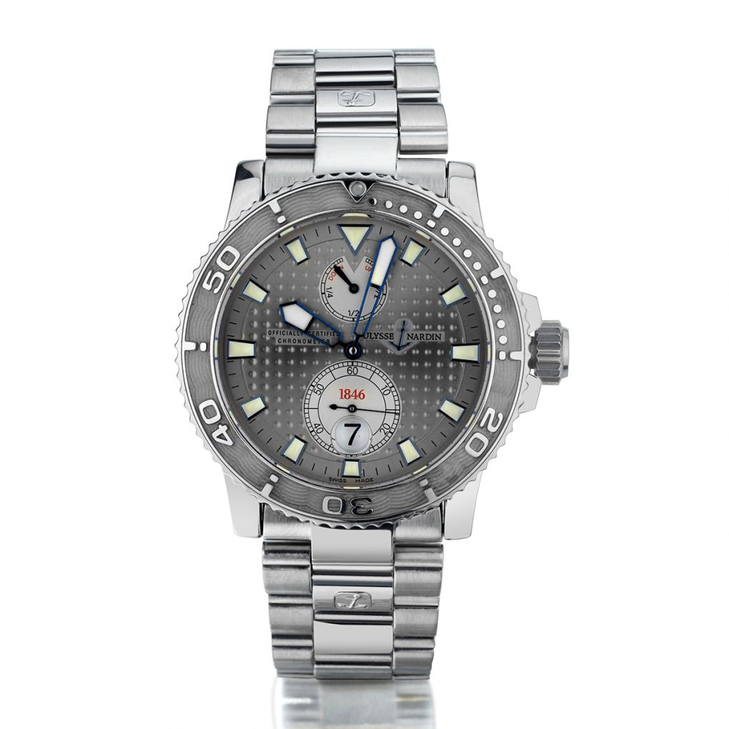 Gent's stainless steel Ulysse Nardin Maxi Marine Diver wristwatch. Integrated stainless steel bracelet. Silver dial with magnified date window and seconds sub-dial at the 6 o'clock position; power reserve indicator at the 12 o 'clock position. Automatic movement. 43mm case diameter. 12.5mm thick. Sapphire crystal. Solid caseback. Reference #: 263-33.