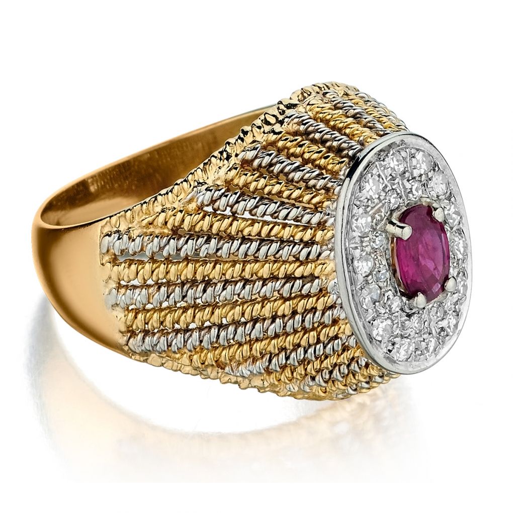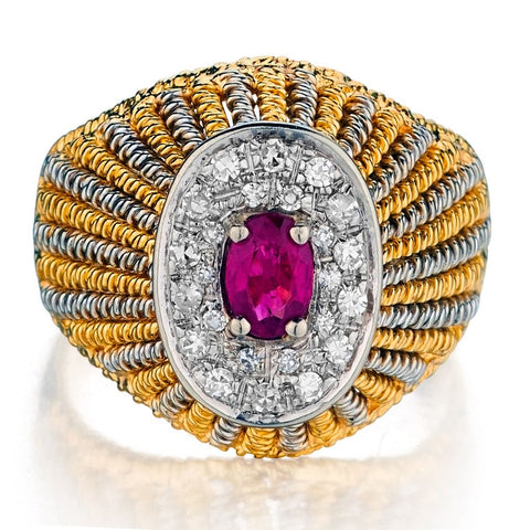 Ladies 18kt yellow and white gold Ruby and Diamond dome shape ring . Beautiful yellow and white gold textured weave detail. This ring contains an Oval Ruby weighing approx. 0.40 carat weight. It is surrounded by 0.50 total carat weight of Brilliant cut diamonds of (SI) in clarity and (G) in colour. Measurements:19mm(L) x26mm(W) x 10mm(H).Current size 8-1/2. This ring can be resized. Circa 1960's