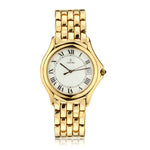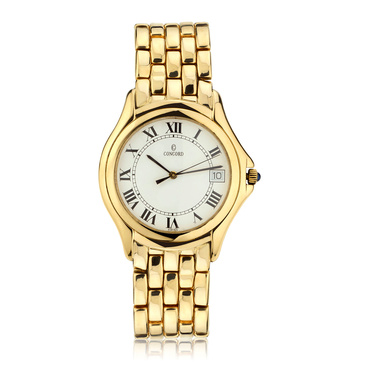 Unisex Concord Imperial in 14kt yellow gold wristwatch. Integrated 14kt yellow gold bracelet. To fit wrist size: 8-1/4'. White dial with black Roman numerals. Date. Case size: 34.5mm. Quartz movement. Total weight: 67.9 grams. Sapphire crystal. Reference number:  28-72-233.