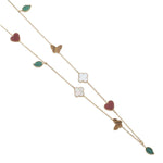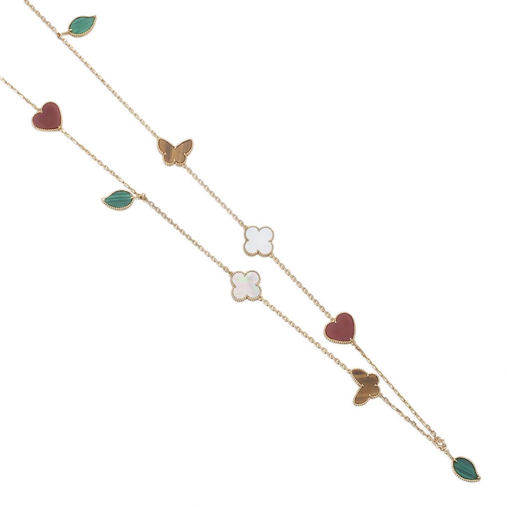 Ladies beautiful 18kt yellow gold Van Cleef and Arpels Lucky Alhambra long necklace, 12 motifs with carnelian, tiger's eye, white and gray mother of pearl, and malachite. These gemstones are shaped as hearts, butterflies, leaves and clover shapes. Hallmarked: VCA AU750. 34.5" in length. Reference #: VCARD80100.