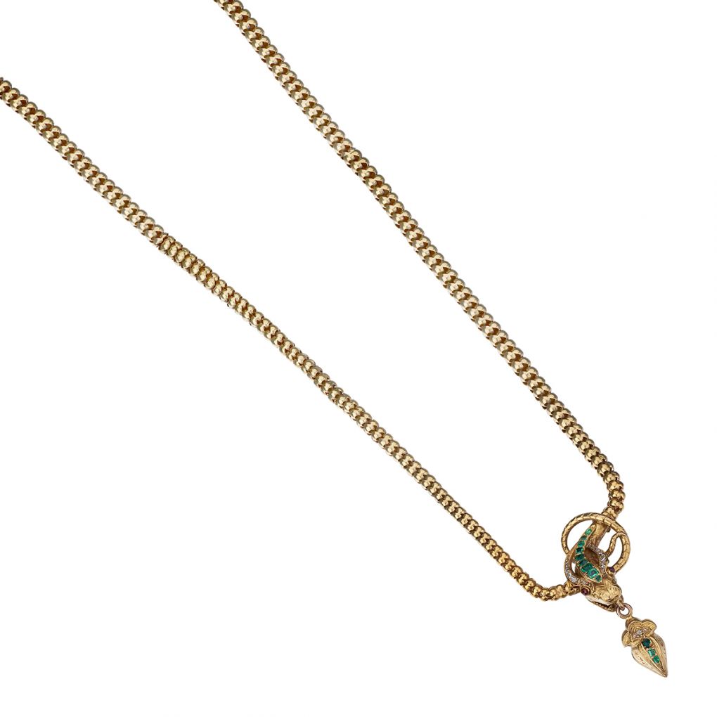 Ladies 15kt yellow gold snake pendant hand engraved. Graduated link chain featuring emerald and diamond with ruby eyes. Mourning necklace. 15" in length. 20.8 grams in weight.