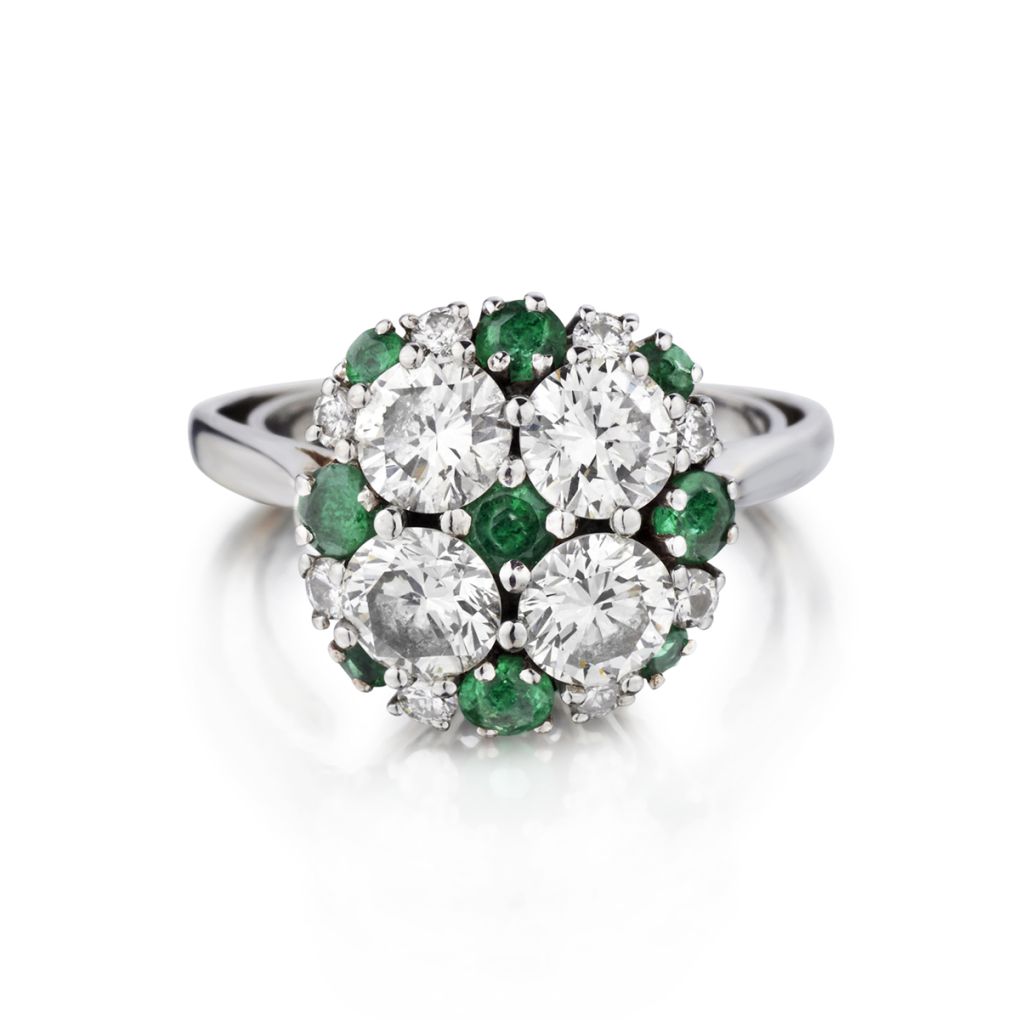 • Vintage Diamond and Green Emerald Cluster Ring.