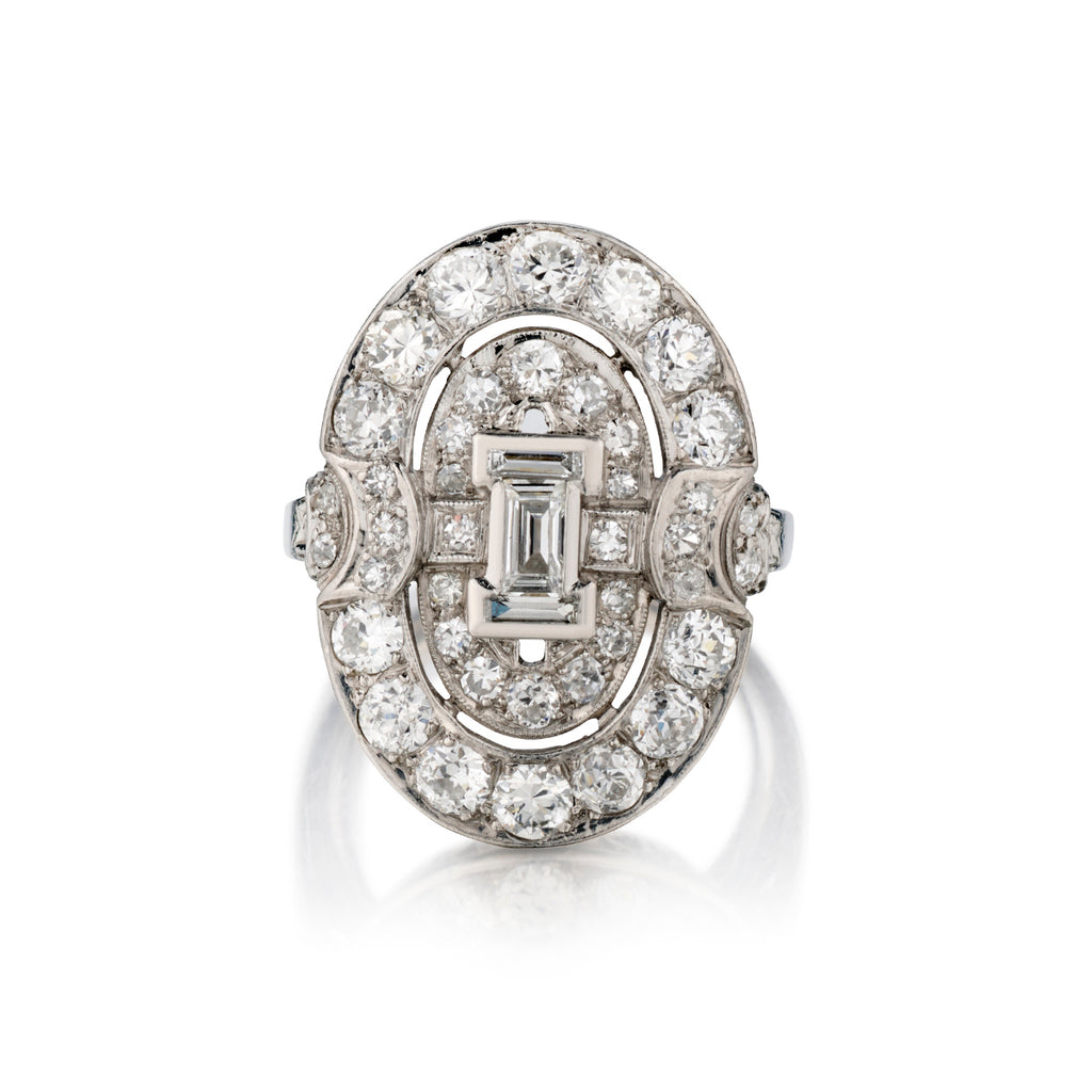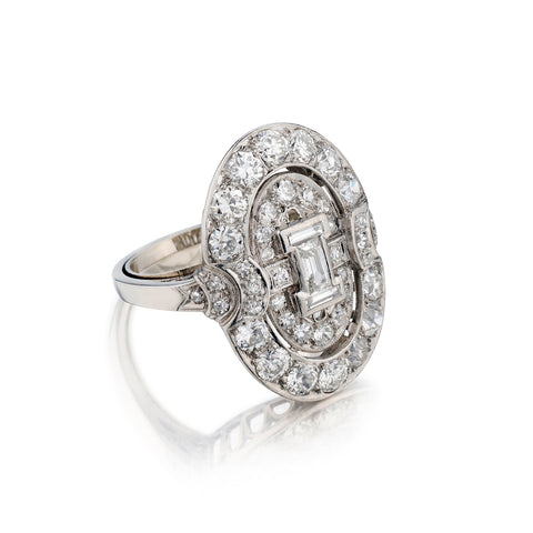 Vintage Platinum and diamond ring. This ring is oval in shape. It features 35  x 3.10 total carat weight of European cut diamonds and 4 x 0.25 total carat weight of Baguette cut diamonds. Measuring: 24mm x 18mm. Beautiful vintage workmanship. Art Deco Era. Current finger size: 5-1/2. This ring can be resized.