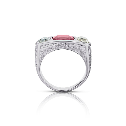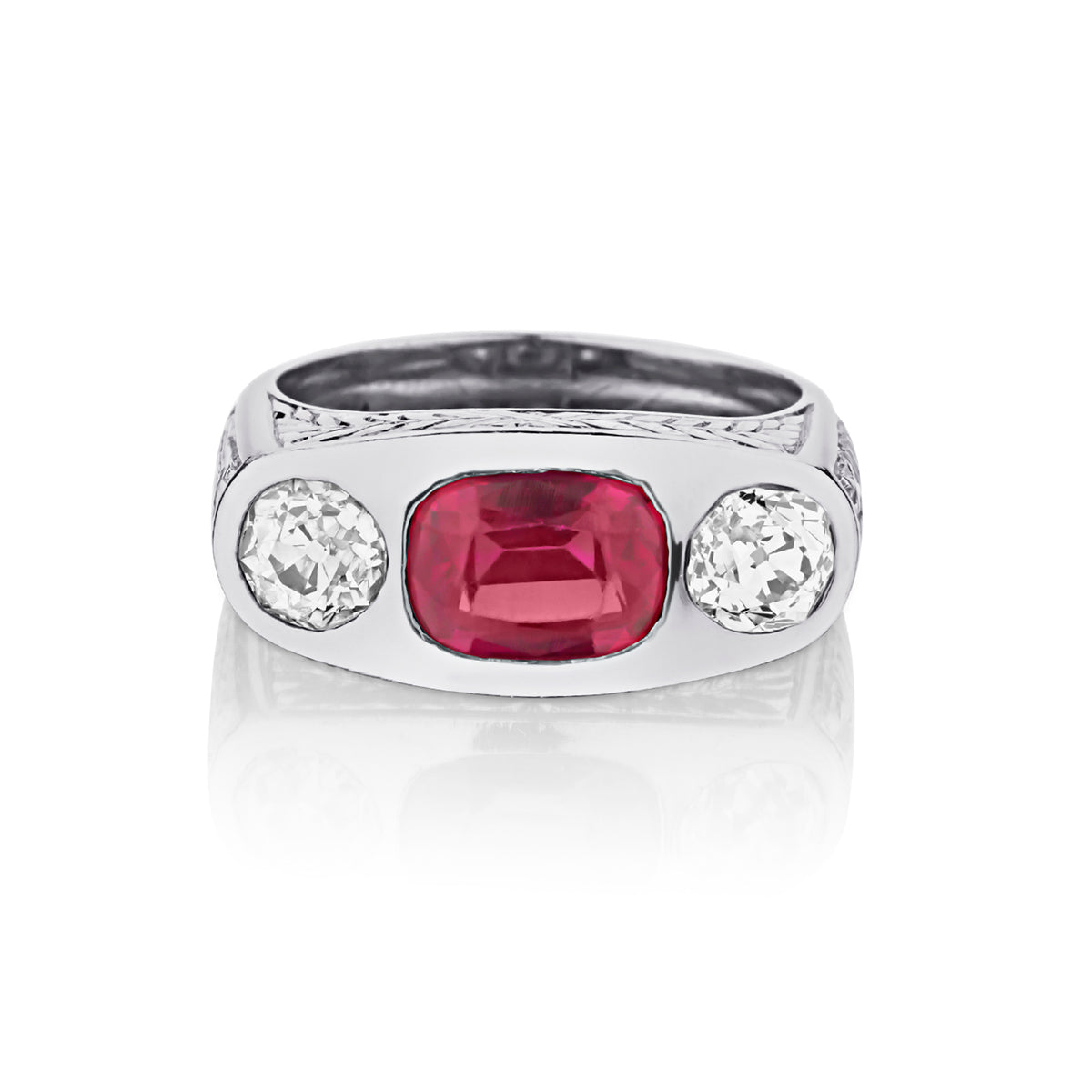 Vintage Platinum Red Stone and Mine Cut Diamond Ring. Georgian Era.