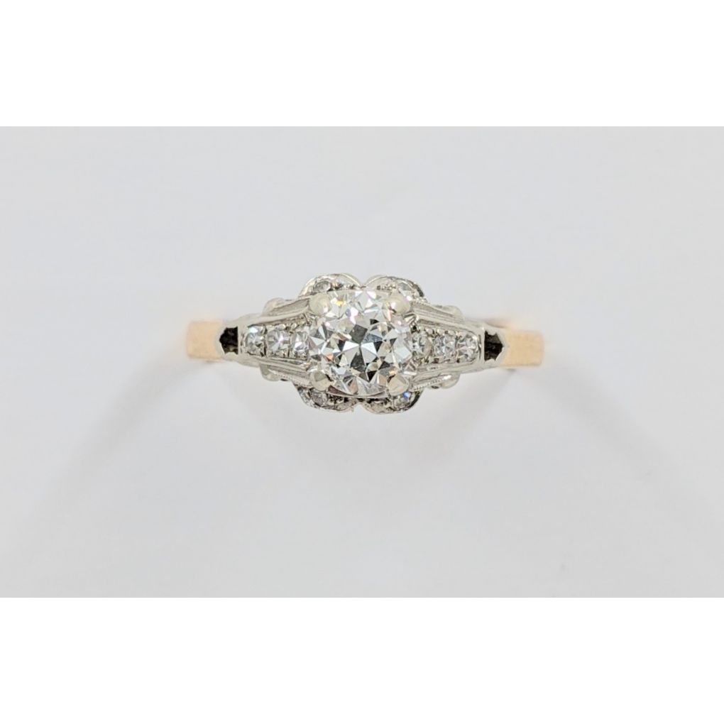 Vintage charming 14kt white and yellow gold Vintage diamond ring featuring  a European cut diamond weighing  0.55 carat weight of  (J) in colour and (VS) in clarity .Also featuring 10 round single cut diamonds weighing .10 total carat weight .The current finger size is 6 1/2. It can be resized