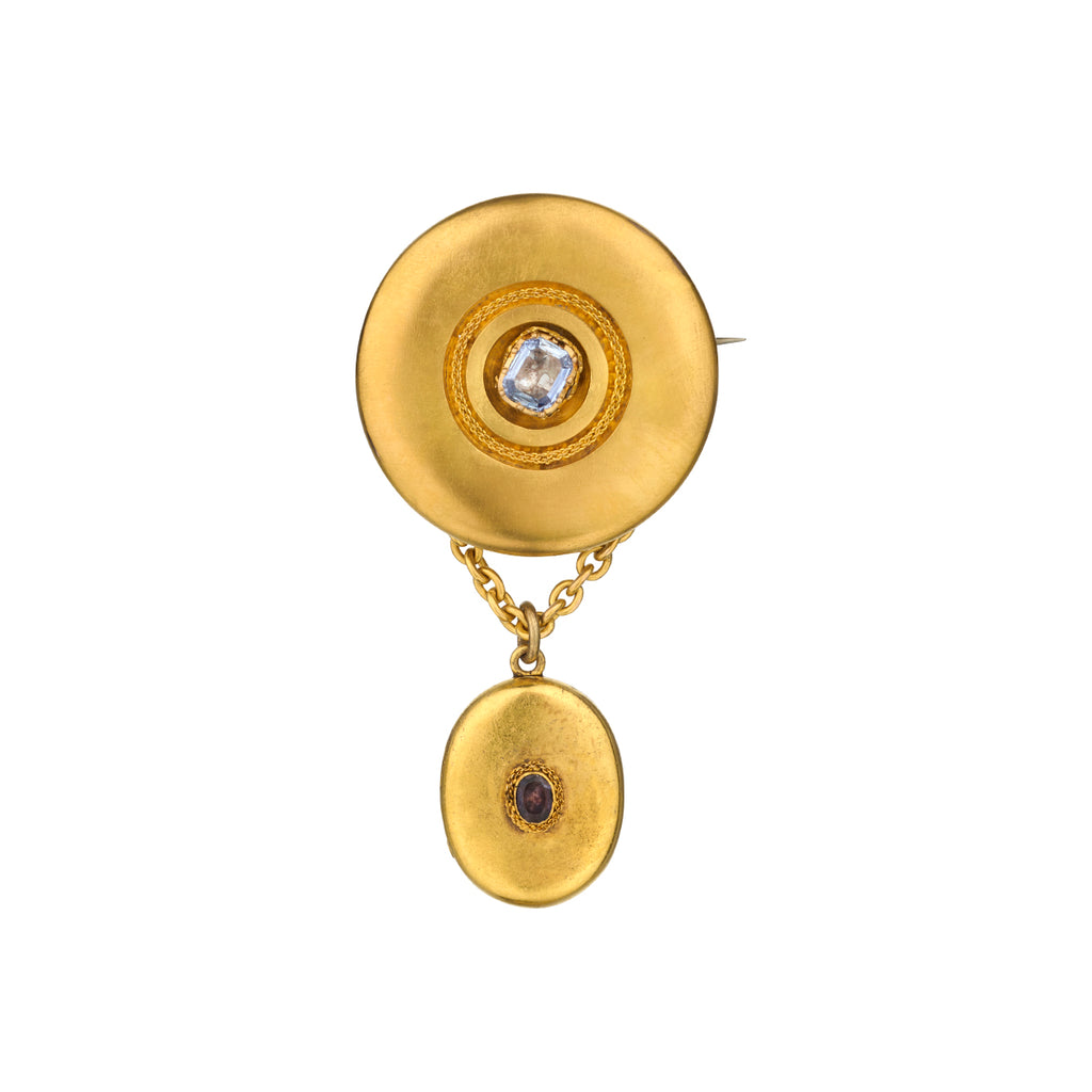 • Vintage Victorian 18kt Yellow Gold Brooch and Locket with Blue Sapphires.