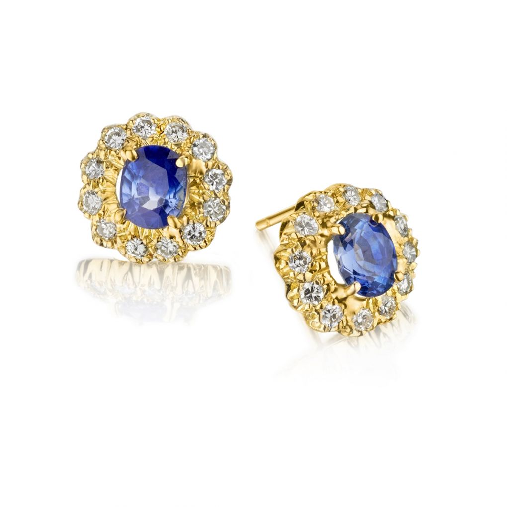 • Yellow Gold Cornflower Blue Sapphire And Diamond Halo Flower Earrings