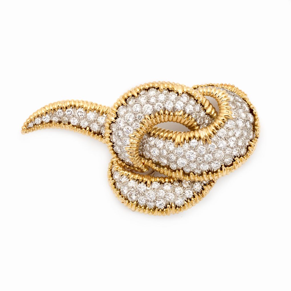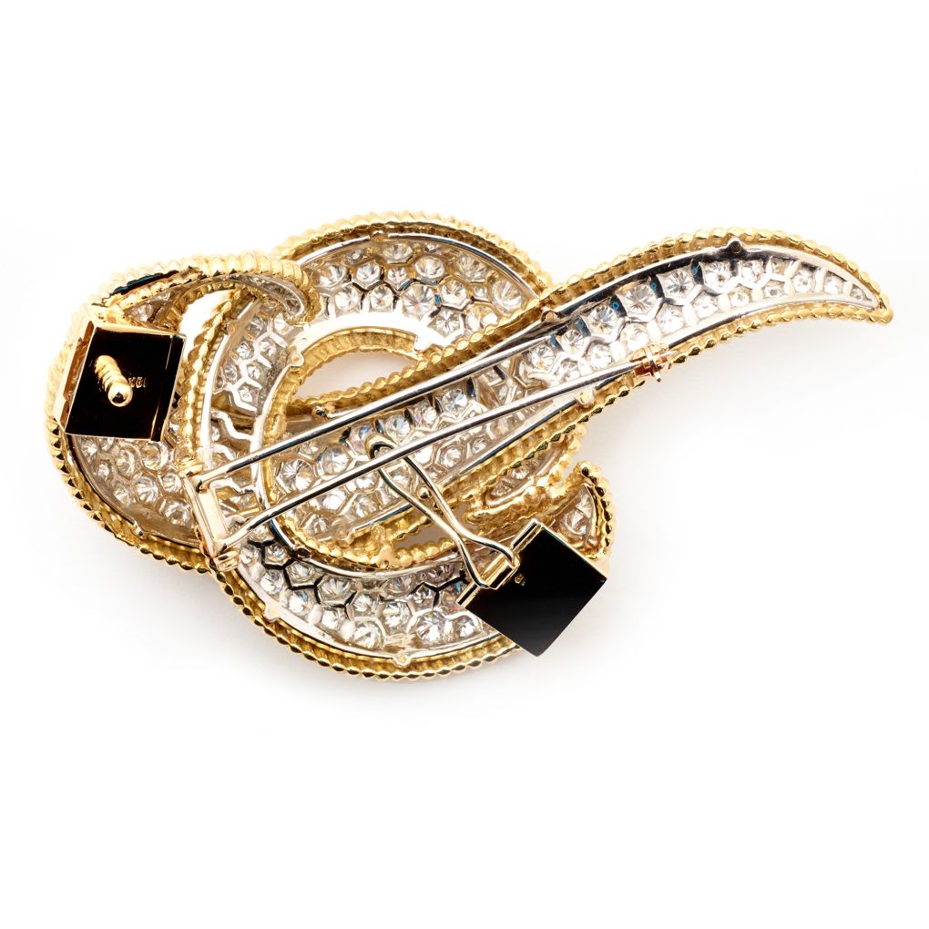 Ladies exceptional 18kt yellow gold Tubogas necklace centering a detachable pendant/brooch ribbon containing approximately 22.00 carats total weight of pavé-set round brilliant cut diamonds of (VS-SI) in clarity and (F-G) in color. Gross weight 228.60 grams. This tubagos necklace can be worn without the diamond brooch. This diamond brooch can also be worn seperately. Extremely versatile for every occasion.
